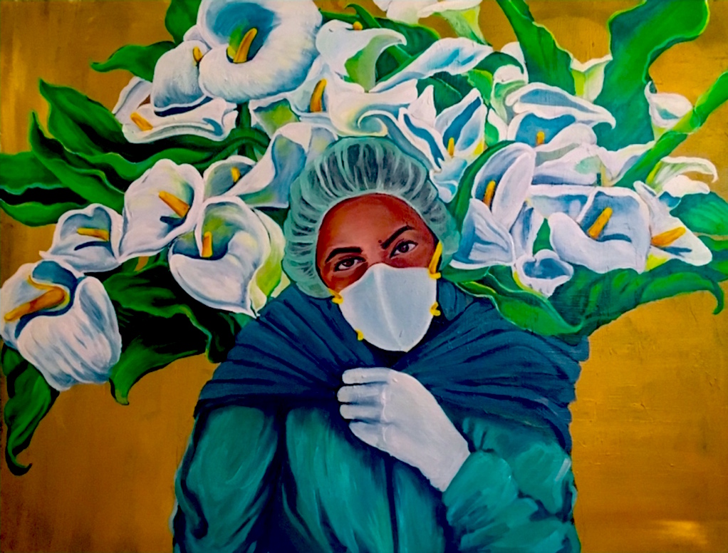 “This painting celebrates the heroic effort of nurses in the frontline of the COVID-19 crisis. While society is saving its own unprepared sanity through an escapism into fantasies, conspiracy theories and narratives sourced from sci-fi and apocalyptic films, the real sheroes, wearing real masks save the real world. Sheroes: real mothers, real daughters, real sisters and neighbours are separated from the perceived salvation of these fantasies by their crude reality in the mist of an unknown future.